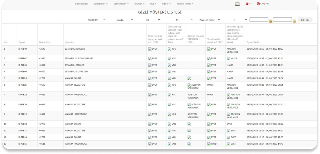 Ziyaret sırasında, müşteri hizmeti kalitesi, çalışanların tutumu, hijyen standartları, ürün sunumu ve diğer operasyonel süreçler değerlendirilir. Elde edilen veriler, belirli bir kriter setine göre puanlanır ve raporlanır.